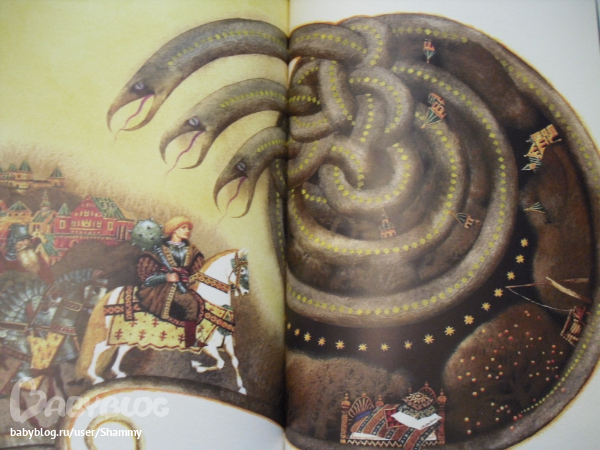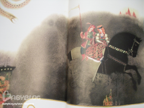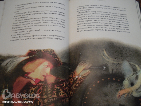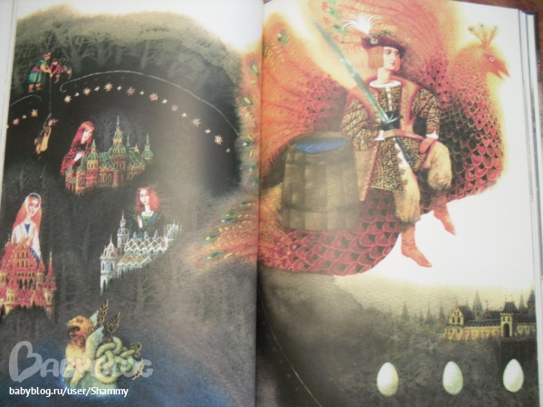 Очень красивые иллюстрации на целый разворот! В одной картинке весь сюжет практически персказан. И вон братья младшенького своего в подземное царство спускают, и вот вам три сестры-красавицы в своих замках, вон и три яйца, куда они потом свои замки-то и спрячут. А вот и главный герой на жар-птице, что его из подземного царства-то и вынесла.