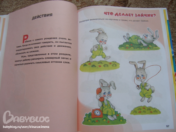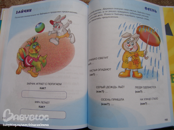 Очень понравилась книжечка, хороший офсет средней плотности, иллюстрации приятные, задания разнообразные (которые предлагает выполнить Зайчонок). Оно конечно рассчитано для деток постарше от 3-4х лет, но некоторые задания можно и для двухлеток адаптировать. Вообщем оч. рада что купила, интересное пособие.