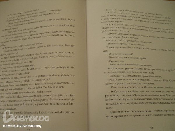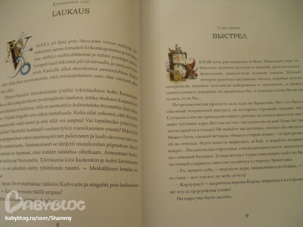 Как я уже писала, книга издана на двух языках - русском и финском. Выглядит это так. На одной странице русский текст, на другой финский. Т.е. повествование идет на двух языках параллельно. Не знаю, насколько будет удобно читать, но особо не отвлекает))