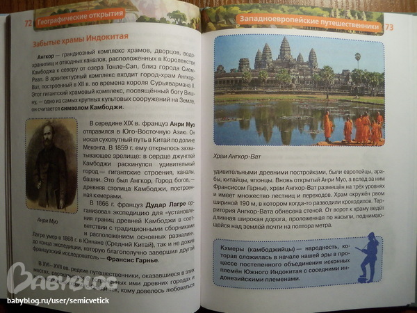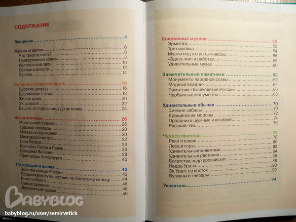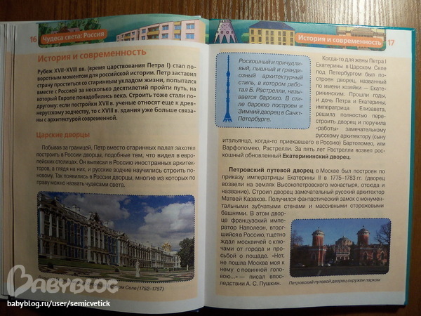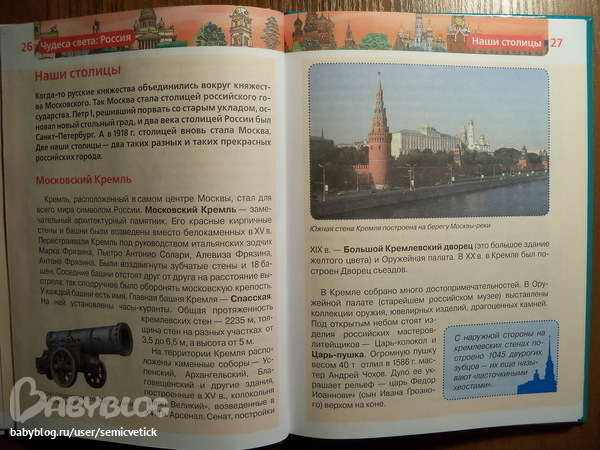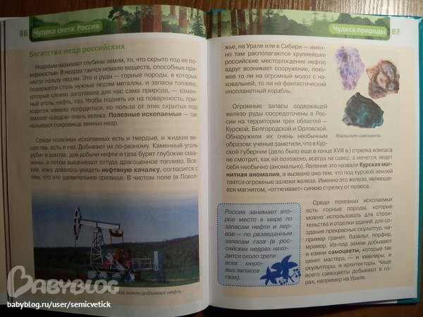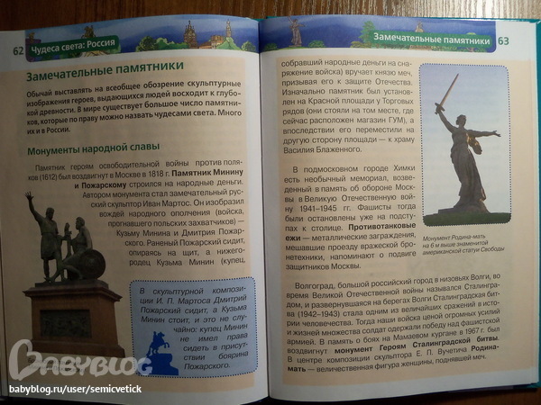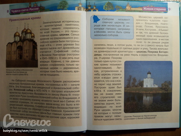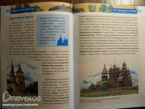 Чудеса света. Россия. Бумага тонированная (на фото видно), достаточно много фотографий (правда, мелких), есть и рисунки. Я не скажу, что прочитала всю книгу, пока пролистала и прочитала несколько статей. Язык легкий, понятный школьникам, есть примечания в отдельных рамочках, сообщающие что-то интересное. Достаточно много "чудес" освещено, понятно, что все кратко, но есть и даты и немного истории. По этим темам я собираюсь приобрести и более подробные энциклопедии, а эти подойдут, наверное, для первого знакомства.