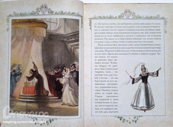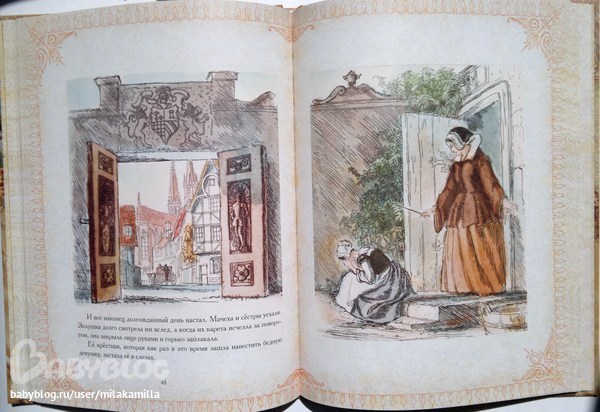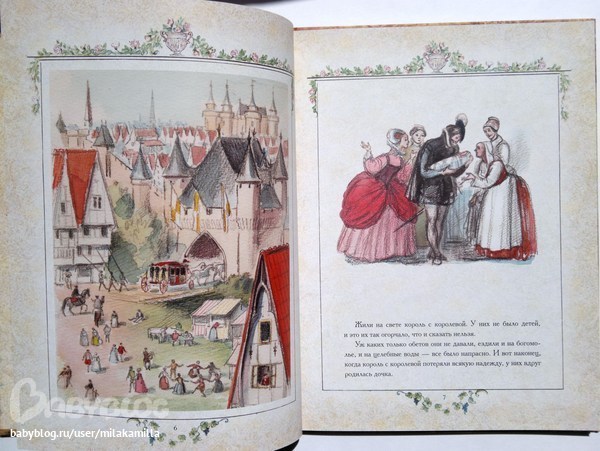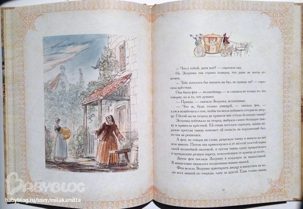Долго я думала, о необходимости покупки сказок Шарля Перро в илл. Рейпольского, и сомнений было много. Во -первых, мне сначала показалось, что книга мрачновата, во-вторых, сказок Перро у нас уже много, в-третьих, можно было вместо нее купить другую книгу. НО, она настолько оказалась красивой, что я ничуть не жалею о покупке. Во-первых, обложка... она напоминает мне старинную мраморную колонну. Вся обложка с красивым тиснением вокруг гладкой нежной иллюстрации. Самое интересное оказалось внутри. Форзац напомнил чем-то книги с историей, своей тонировкой, страницы книги украшены тончайшим ажурным рисунком и тоже тонированы в светлый бежевый цвет. Иллюстрации и текст помещены в рамочки, но они, на мой взгляд, очень гармонируют друг с другом. Бумага плотная матовая мелованная, шрифт красивый, крупный, большой межстрочный интервал. Иллюстрации Рейпольского... Просто поразило качество иллюстраций в этом издании, такое впечатление, что они были прорисованы прямо в книге, виден каждый штрих, каждая черточка, след от карандаша, особенно там, где принц продирается сквозь заросли шиповника к Спящей красавице. Самая любимая моя иллюстрация, это грустный принц, которому от Золушки осталась лишь туфелька, правда она почему-то не попала в кадр . О содержании говорить не буду, сказки известные и любимые каждым с малых лет.