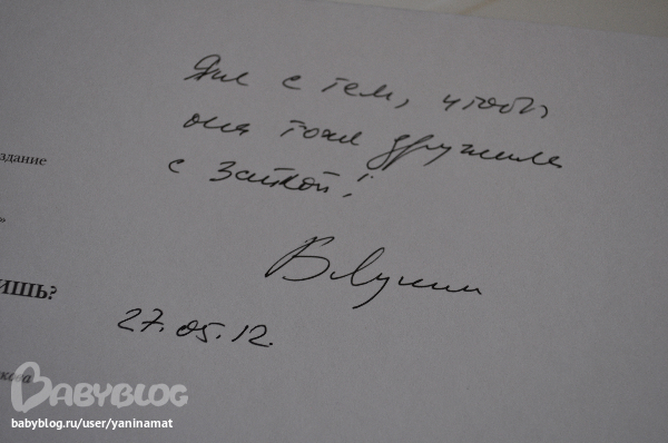 "С кем ты, зайка, дружишь?" Виктор Владимирович подписал маме))))) вряд ли он догадывался, что девочке Яне 25 годиков))))) С зайкой я всегда буду дружить, никогда не брошу, обещаю))))