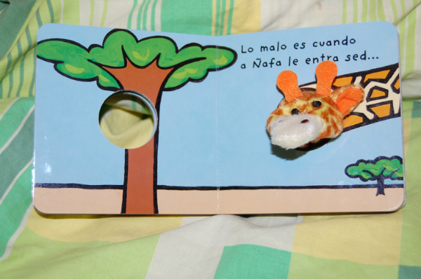 Книжка-малышка про жирафиху Няфу тоже очень нравится. Толстые страницы хорошо грызутся, жирафой можно играть, в дырку - засунуть палец, в общем, все тридцать три удовольствия.