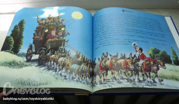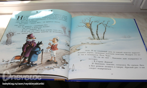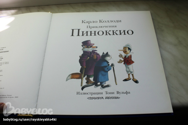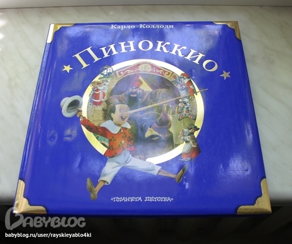 А вот пиноккио до этой грандиозной раздачи слонов я была свосем не уверена, что нам надо, а он оказался просто отличным опять же, за исключением обложки. Формат большущий (около 30 на 30), обложка"пухлая", и это они зря. Иллюстрации, как по мне, вполне милые: