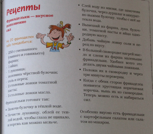 Так вот, чтобы все умение не ограничилось бутербродами и мытьем посуды, у нас появилась книга "Маленький повар", которую Матюха не выпускает из рук второй день уже. И ведь читать не умеет, но все равно ходит с ней и подготавливает бабушку морально, что "завтра я буду готовить фрикадельки". :)) Чем мне понравилась именно эта книга - в ней опять же картинки с юмором и много дополнительной информации о продуктах. Даже (беременные и гринписовцы - зажмурьте глаза, закройте уши) есть рисунки с коровкой в разрезе, а также как называется та или иная часть. ну там - окорок, филейная часть и ты ды:)). Ах, да, еще написано - чем полезен тот или иной продукт. например в "луке" нашла рецепт при простуде. не путать с Малаховым, никаких дополнительных чакр и чудодейственных травок:))