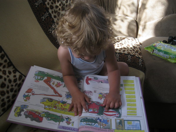 Это просто мега-супер-пупер хит у нас. Причем первые пару месяцев книга стояла на полке не особо востребованная, зато сейчас у меня уже начинаются нервные конвульсии только от одного взгляда на нее - мы читаем ее раз по 5-10 в день, ежедневно! Естественно читаем и другие книги, но ничто не может вытеснить именно эту книгу из фаворитов. Любимое занятие, конечно же, искать жука. И если раньше я говорила, что он, например, в синем автобусе или фиолетовом лимузине, то сейчас ребенок находит жука гораздо быстрее меня на всех страничках. Интерес, уверенна, не исчезнет очень долго. Так что всем-всем, у кого мальчишки (а у кого-то и девчонки) интересуются транспортом, настоятельно рекомендую эту книгу.