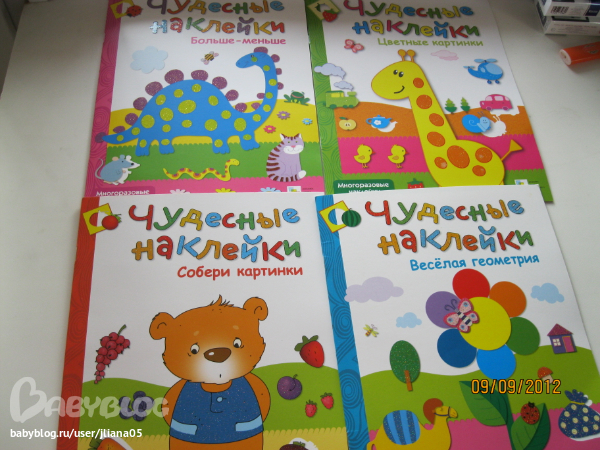 Чудесные наклейки: Больше-меньше, собери картинки, веселая геометрия, цветные картинки.