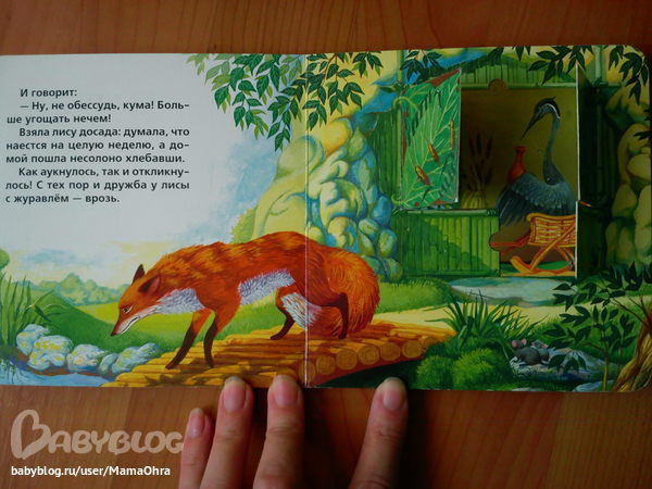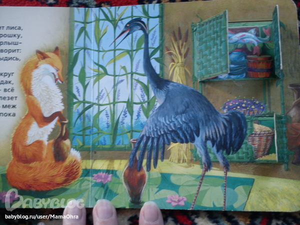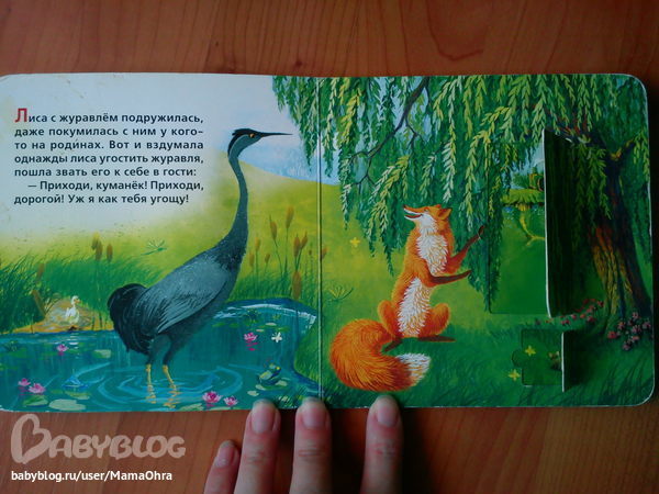 есть еще у нас вот такая книжечка с окошками про лису и журавля от изд. аркаим. очень сиьно мы ее любим. причем до сих пор... там еще на обложке лисичка тактильная. обложку в приличном виде к сожалению сохранить не удалось, тк читать эту книгу начали в полгода.. так что фото оболжки из нета