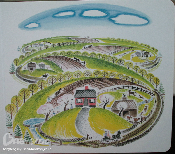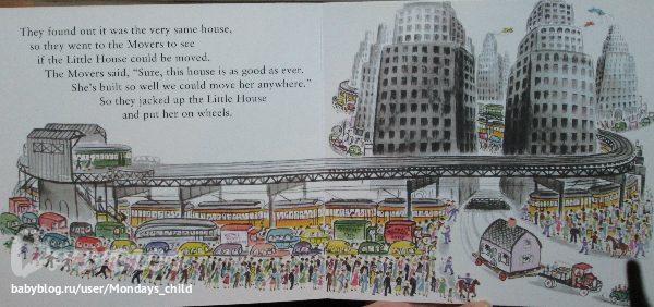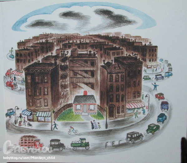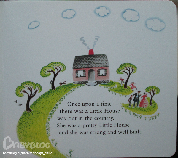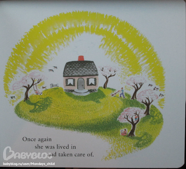 Вторая - The Little House, автор - Virginia Lee Burton. Это классика, издана в 1942 году и переиздается до сих пор. Сын полюбил ее в прошлом году, я в библиотеке брала. Все лето периодически требовал читать книжку "про домик" (а мы были в России и книжки не было, естественно). Сегодня я ему купила ее, принесла домой: "Ух ты! Давай читать!" И вот так с воплями "Читать! Читать!" носился вокруг, пока я переодевалась и разбирала продукты. Вот такая любовь:) А сюжет простой: жил-был себе домик, никого не трогал, любовался рассветами и закатами, луной и звездами, смотрел как сменяют друг друга времена года, зреют яблоки, дети купаются в пруду... А тем временем по ночам все ближе и ближе светились огни большого города. И вот однажды рядом с домиком проложили дорогу. И началось - стали ездить машины, вокруг посроили кучу домов, сначала поменьше, потом по 25 этажей, проложили рельсы, стали ездить поезда, потом под домиком прокопали метро. Он уже не видел ни луны, ни солнца, не знал, весна или зима за окнами. Никто не жил уже в домике. Но тут однажды пришла женщина и узнала домик, в котором жила ее бабушка, когда она сама была маленькой девочкой. Она пожалела домик и увезла его из города. Его отремонтировали, он снова стал любоваться природой, солнцем и цветами и снова стал счастливым. Вот такая история о противостоянии природы и цивилизации))