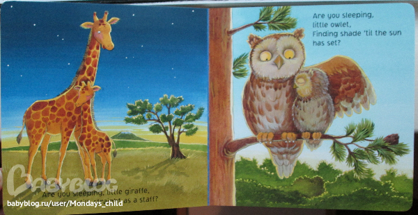 Очень симпатичные рисунки, хорошо читать перед сном. Все зверюшки спять, Маше тоже пора)) Текст простой, там стихи, но по сути - подписи к картинкам: "Спишь ли ты, маленький фламинго, стоя на одной ноге под лунным светом" и т.п. Ничего особенного, но приятная книжка для малышей.
