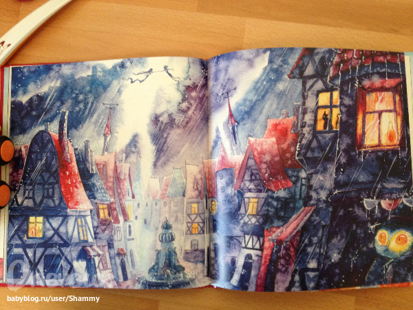 Сказка Армена Ватьяна "Флюгер" с совершенно изумительными акварельными иллюстрациями Анастасия Мазеиной. В книге рассказывается романтическая легенда одного старого города. На шпиле одной из крыш стоял флюгер в виде юноши. Как-то мастера города поставили рядом другой флюгер - в виде прекрасной девушки. Юноша сразу же влюбился в прекрасную соседку. Но вот беда - флюгер покорный раб ветра - куда он дует, туда флюгер и поворачивается. Поэтому юноша и девушка не могли сомтреть друг на друга, а видели только спины друг-друга. Но вот однажды взыграла страшная буря. Беспокоясь за свою возлюбленую, юноша с огромным усилием развернулся против ветра. Ну а затем... Затем он закричал любимой, что и в ее силах дать отпор ненавистной стихии. Девушка повернулась, влюбленные соскочили со шпилей и улетели... Вот так любовь оказалась сильнее ветра... Конечно, в книге все более гладко написано. Мой вольый перессказ не производит такого сильного впечатления. А теперь посмотрит иллюстрации. Форзац.