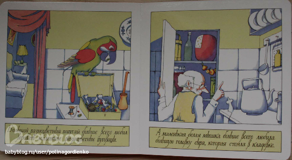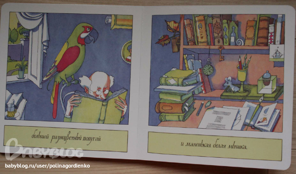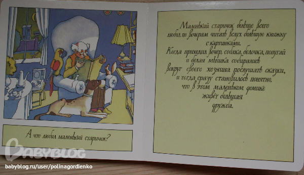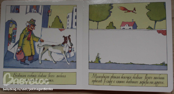 Иллюстрации - на любителя, не знаю, насколько они понравятся всем детям, но вот сюжет хороший для малышей. Тут идет игра с Большим и Маленьким, постоянно автор нас заставляет сравнивать те или иные объекты (большой город - маленькая улица, большой попугай - маленькая мышка, большая собака любит маленького старичка). И ты погружаешься в простой, уютный, детский мир, где эпитетов немного, зато они показывают главное, "что в маленьком домике живет большая дружба".