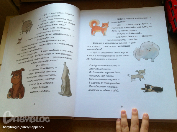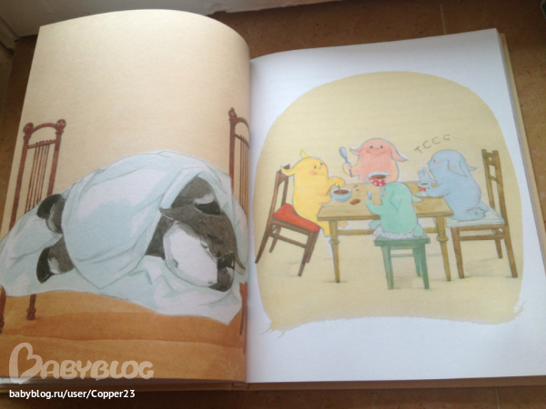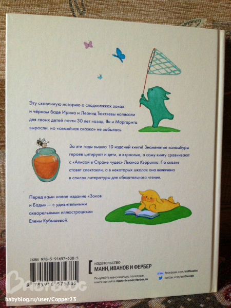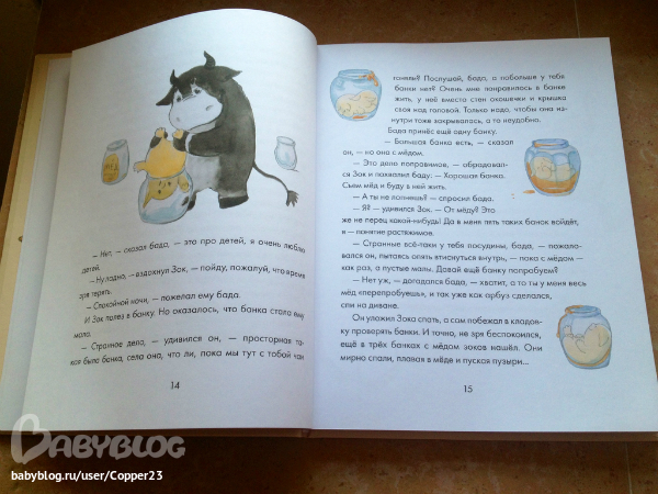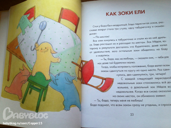 Книга мне очень понравилась именно в офорлении Кубышевой с удивительными акварельными иллюстрациями, нежно-детскими и душевными. Именно так я представляла эту книгу. Издание хорошее, плотная бумага, иллюстрации не блеклые, присутствуют практически на каждой странице. Зоки в этой книги получились милыми хулиганчиками. Любуясь этими иллюстрациями я предствила себя многодетной мамой детей погодок и представила как я бы выглядила к концу дня:)) Пока делала фотки, сына крутился рядом, так и наровил стащить книжку:)))