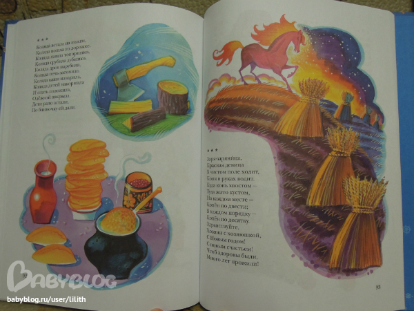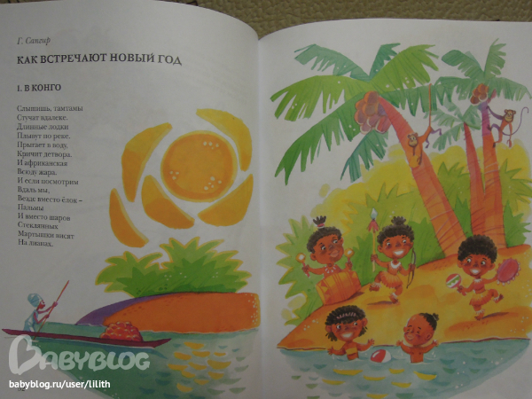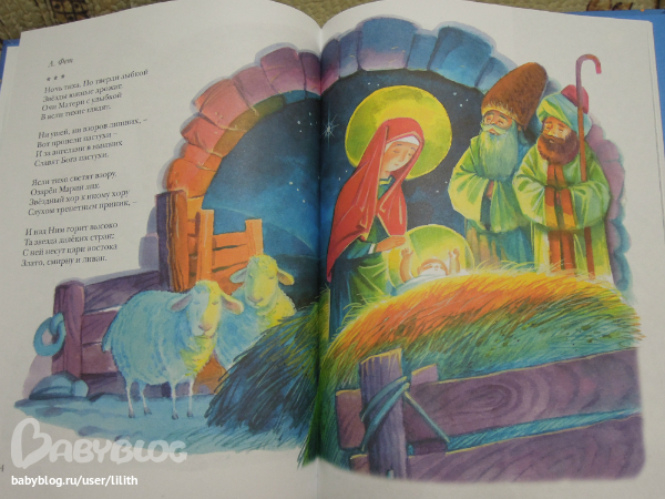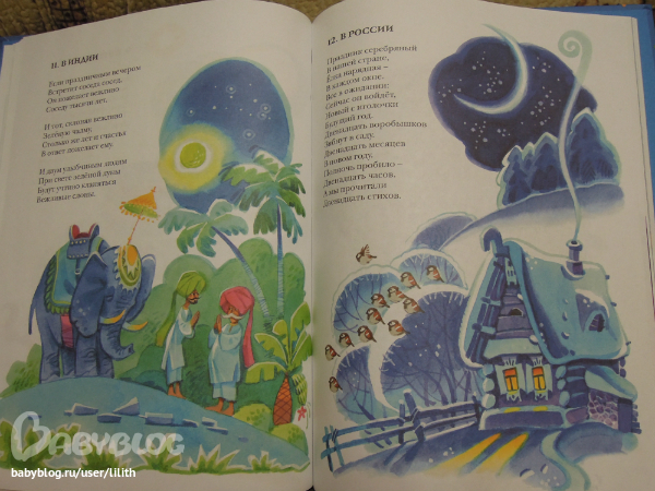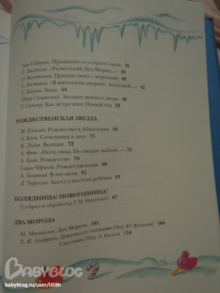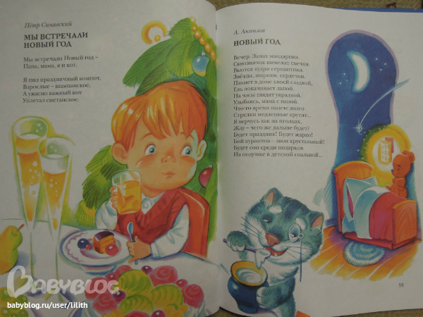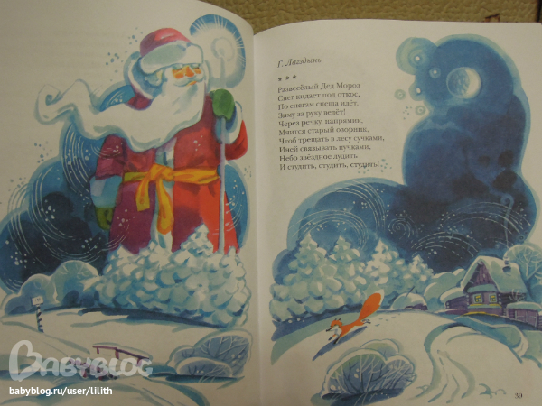Очень хорошая новогодняя книга. Обложка яркая, с блестящими элементами, формат чуть больше А4. По содержанию - хорошая подборка зимних стихов как классических поэтов, так и современных. Отличный раздел стихов про то, как встречают Новый год в разных странах. Отдельно вынесена тема Рождества. В конце две нестихотворные сказки. Далее подробнее: