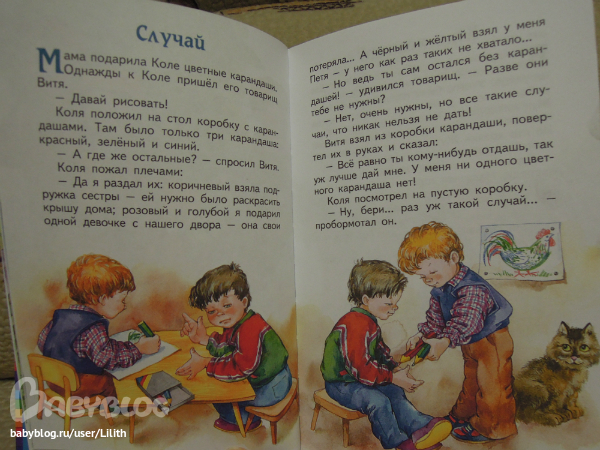 ЗЫ: А вообще вся книга отличная, рассказы на 1-3 страницы максимум, перемежаются стихами. Иллюстрации как в детстве. Я точно помню, что видела все эти картинки, когда была маленькая, и слушала рассказы про простые детские проблемы - как потерял завтрак, как не хвататило карандаша, как подружка не поделилась плащом под дождем. Нике вот прям очень очень подходит по возрасту сейчас. Сейчас, пока фотографировала, Ника крутилась рядом, и по картинкам вспомнила все рассказы, обо всех сказала, что о чем. Значит, все прочитанное впрок пошло.