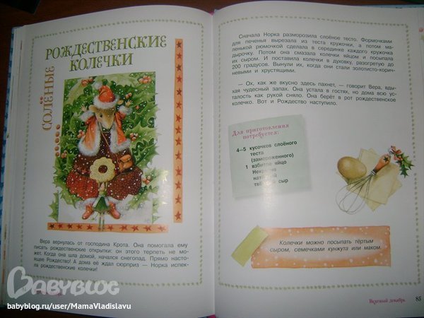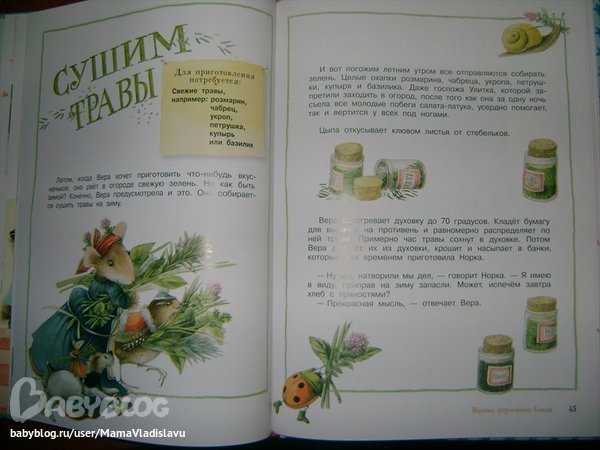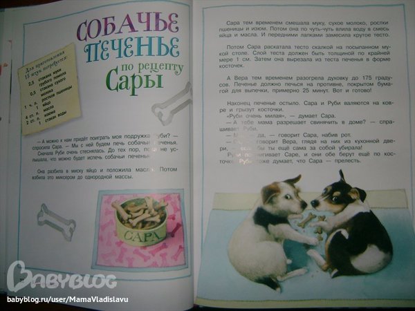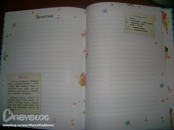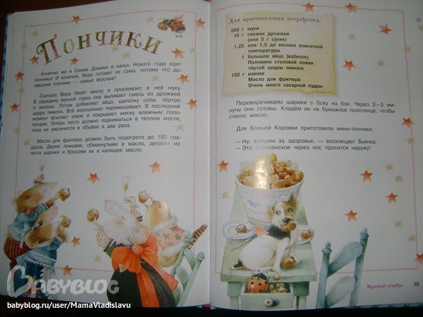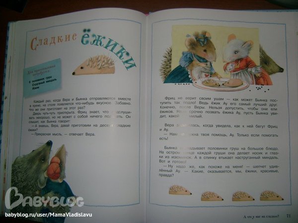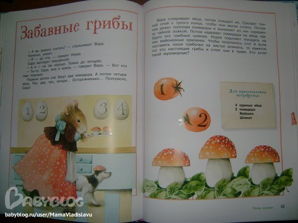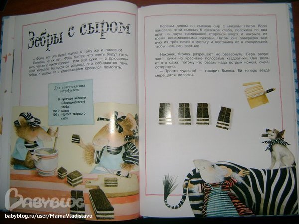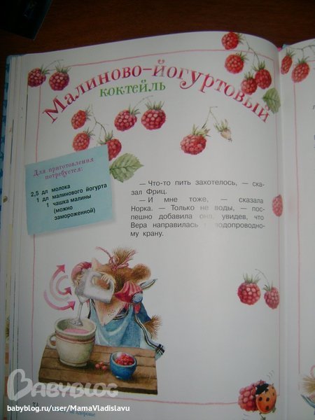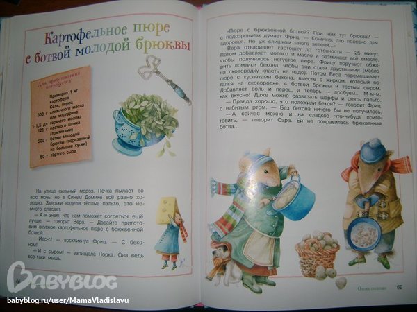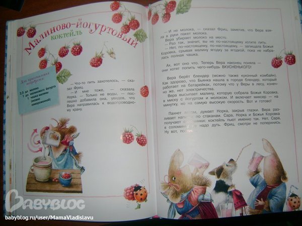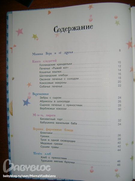 Книга качественная,страницы мелованные,рецепты очень понравились-есть всего по немножко:сладкое,мучное,супчики,омлет,напитки,салаты,варенье-рецепты короткие,написаны простенько и понятно,а с забавной мышкой Верой учиться готовить станет еще интересней)