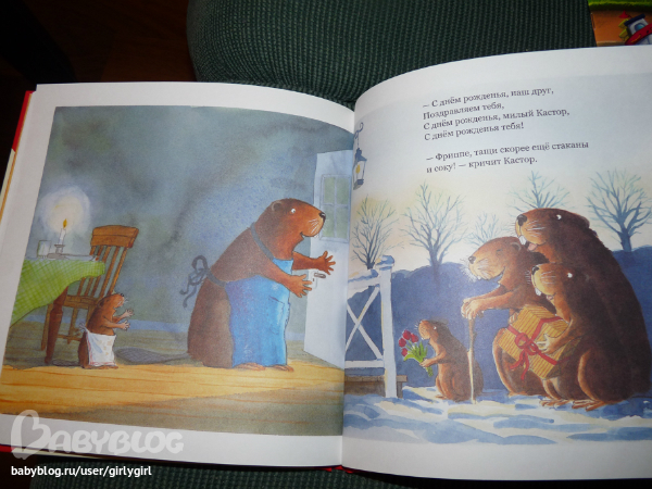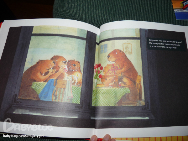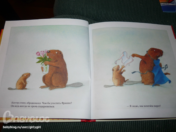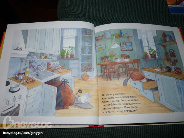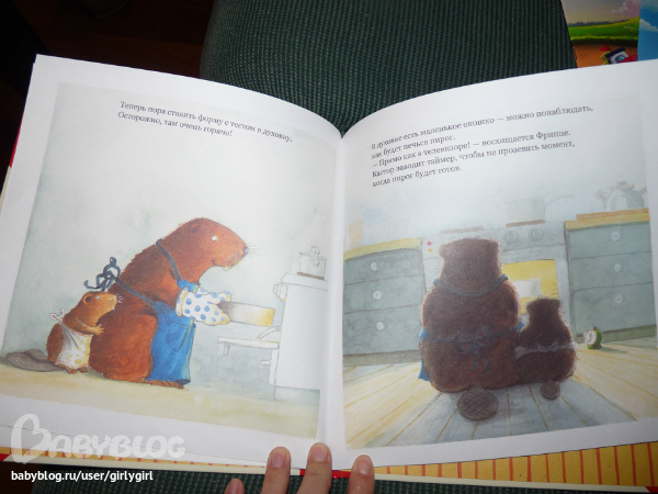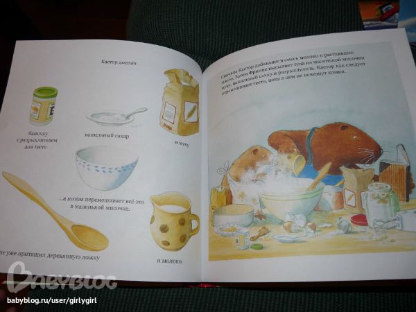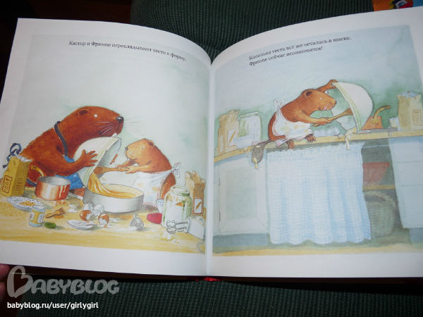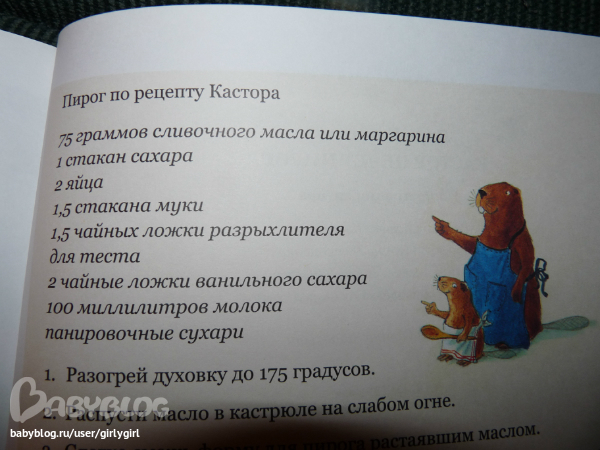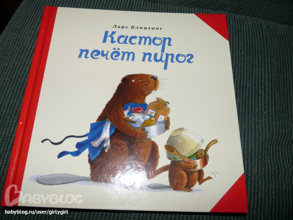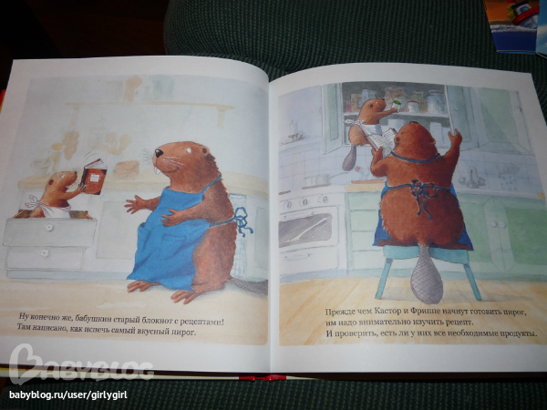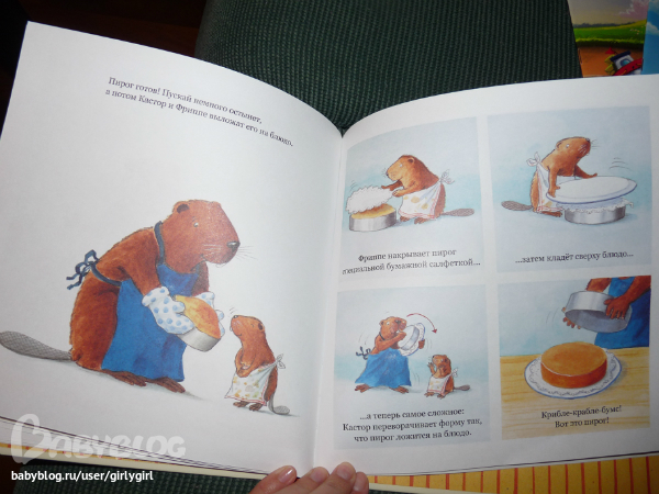 о самой книге: иллюстрации распрекрасные! все нарисовано очень реалистично и продумано до мелочей! все как в жизни)) рисунки очень теплые и уютные...текст простой и понятный. его немного. НО! сколько нового узнаешь из книг этой серии, просто не счесть)) все четко, шаг за шагом, кастор собран и знает, что делает))) а в конце приводится рецепт того самого пирога))