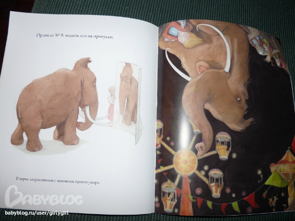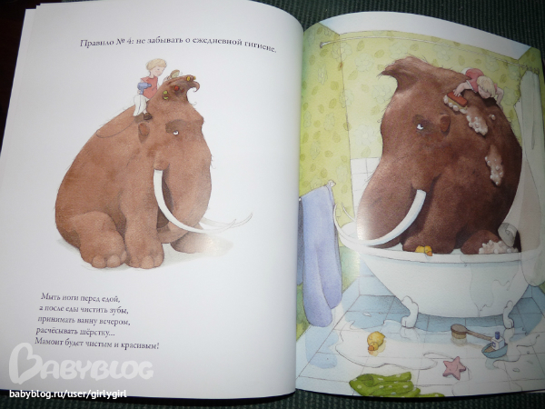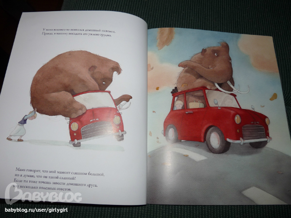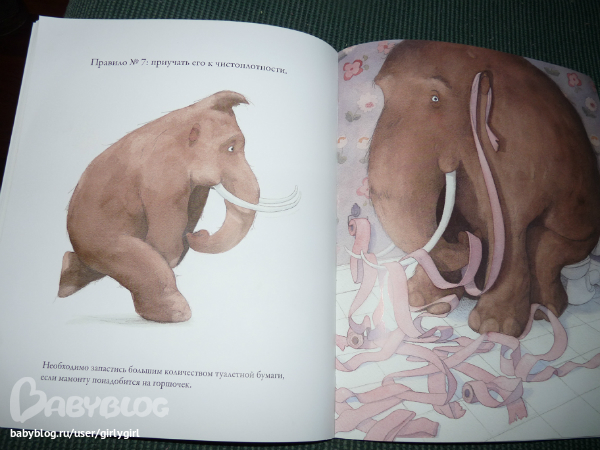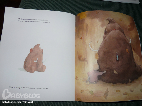 заказала "на пробу" 2 книжечки (уж очень цена была заманчивая по акции от изд-ва). мамонтов взяла 2 ( 1 в подарок) и не прогадала! книга (на мой вкус) почти идеальная!)) иллюстрации чудесные, очень добрые, нежные, но при этом глазки мамонта сверкают хитринкой)) в общем, как настоящий на всех страницах) но собственно и книга об этом)) чем заниматься с малышом и что они любят. платону, конечно, больше всего нравится разворот с машиной)) а я во всех красках ему показываю, как тяжело запихивать тяжелого мамонта в мааааленькую машинку. ну и по ходу всей книги акцентирую его внимание на том, что кое на кого похож этот чудный мамонт)