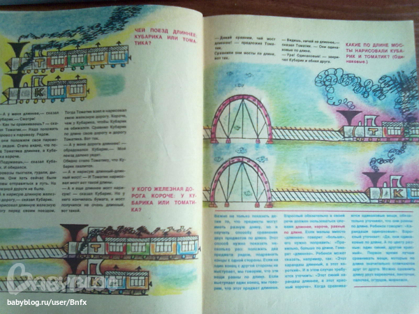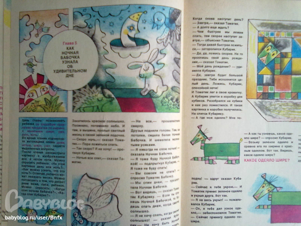 Качество - почти новые (вторая часть особенно), и, хоть видно, что ими пользовались, приятно брать в руки. К слову, наша книга, купленная мамой еще в те времена когда я, наверное, только начинала ползать, была зачитана всеми нами и племяшками до такого состояния, что ей не помогает уже даже очередная склейка. Но это была самая читаемая книга дома и в автобусах-самолетах-поездах-на пляжах-в гостях у любых родственников куда бы мы ни уезжали. Конечно, в ней не такие сочные и яркие иллюстрации, как в сегодняшних лощеных книгах только что из под печатного пресса, и картинки нарисованы ну совсем простенько, как будто наспех, но они настолько насыщены по содержанию, что их можно рассматривать и обсуждать с ребенком бесконечно, придумывая на ходу что-то свое помимо богатого текста от авторов с множеством маленьких заданий на сообразительность, внимательность, запоминание. А еще можно узнавать новые формы, цвета, действия, животных, события, способы общения итд итп.