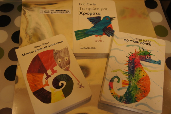 Ну и, конечно, наш любимый Э.Карл... Одну книжку даже привезла из Греции, но там текст не важен и так все понятно... Там нужно лишь совмещать картинку с соответствующим цветом. Я сфоткала несколько разворотов...