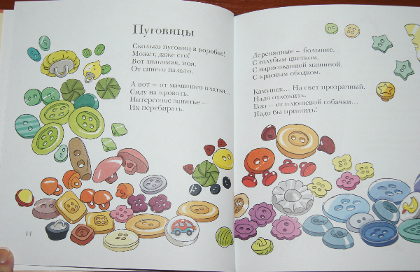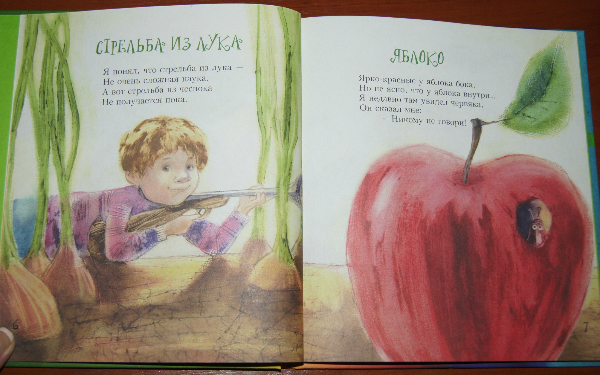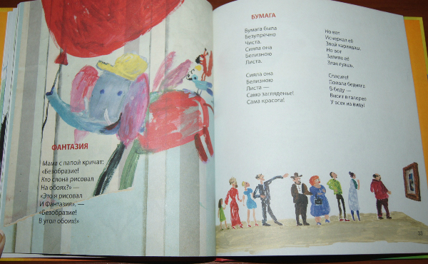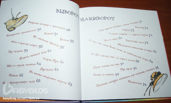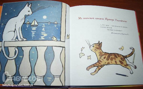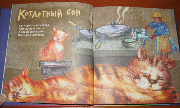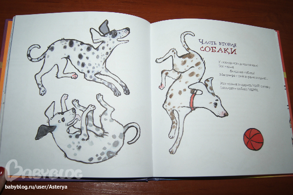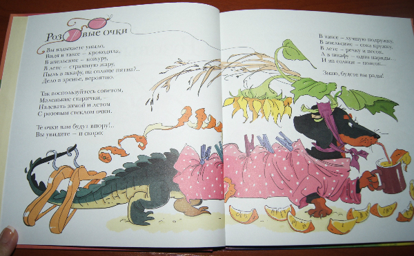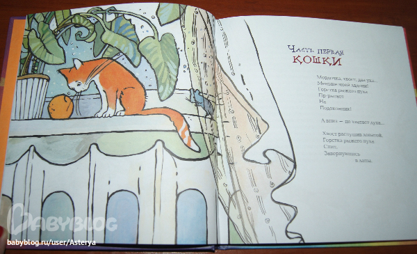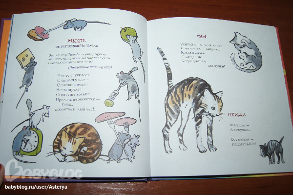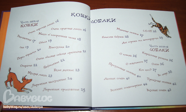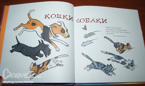 Книга наиболее солидна и разнообразна по содержанию. Помимо уже издававшегося сборника "Выворот-нишиворот" в нее вошел новый цикл стихов "Кошки-собаки",написанный в виде "записных книжек" зверушек. Он меня просто покорил) Да и дочка, на волне огромной любви к этим животным, с удовольствием рассматривает картинки и слушает эти небольшие, но очень милые стихи.