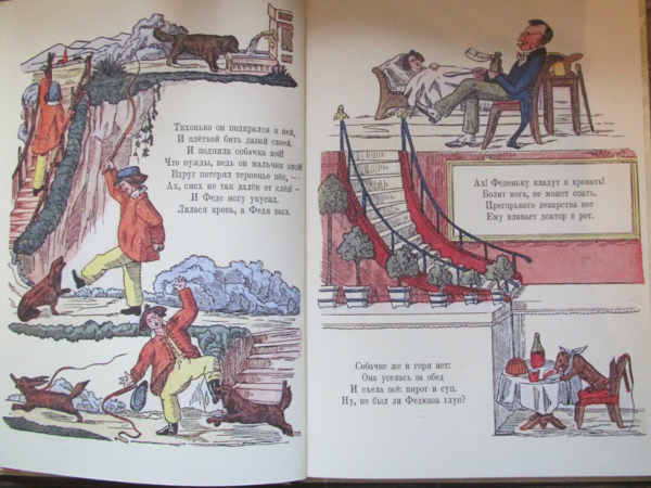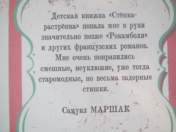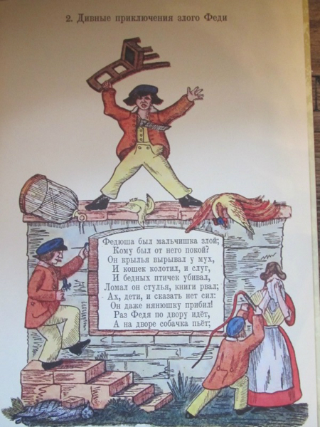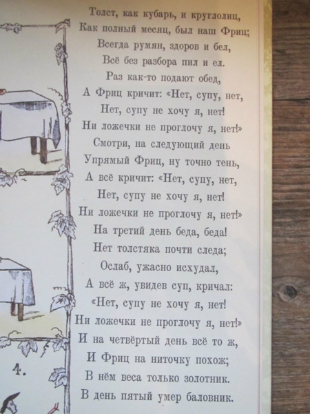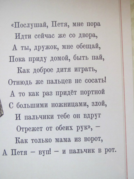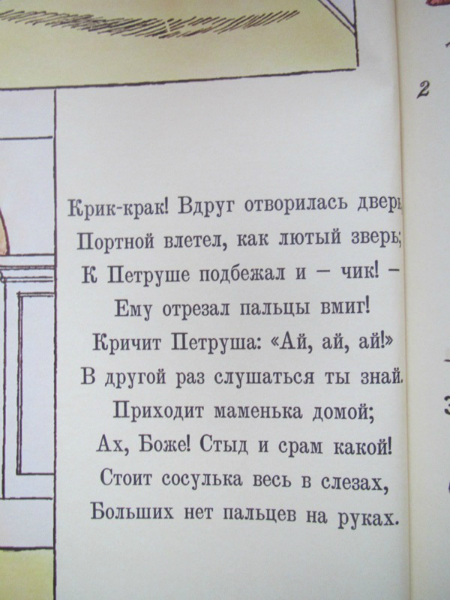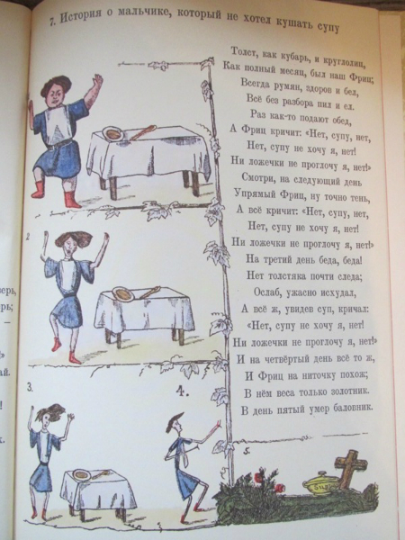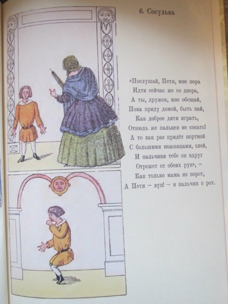 Ох, очень неоднозначаня для меня книга оказалась. Купила я ее естественно из-за названия. В детстве эта книга прошла мимо меня. Поэтому когда я ее открыла, увидела иллюстрации, прочитала текст... волосы мои зашевились на голове от ужаса и я ее убрала подальше. Потом я ее еще раз перечитала и вспомнила как любила в детстве книгу Г. Остера - Вредные советы. Не могу правда сказать, что они на меня действовали и я делала правильные выводы, но читать было весело. И вот книга Гофмана - это теже вредные советы, только для детей, живших в 19 веке. Впервые эта книга была издана в Санкт-Петербурге в 1857 году. Что ж интересно представить себе как сидели мальчики и девочки в детской и слушали как няня им читает эту книгу, а детки все такие красивые в длинных платьях, мальчики в таких курточках... в общем книгу решила оставить себе. Потом прочитала ее Степке, но она произвела на него скорее негативное впечатление, особенно стихотворение, где у мальчика пальчики отрезали, вот он все спрашивал где пальчики у мальчика и проверял свои, очень переживал, говорил что его то на месте, в общем попросил книжку эту убрать. Так что то ли еще маленький, то ли эта книга не наш вариант.