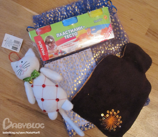 На этом пакетике было написано, что он от снегурочки. Такой чудесный и теплый!!!))) С котенком вот сейчас спать укладываемся,так он ей понравился! Грелочек таких я и не видела раньше, очень полезная штука!!!!! И чудесный пластилин с формочками на крышках))!!!!