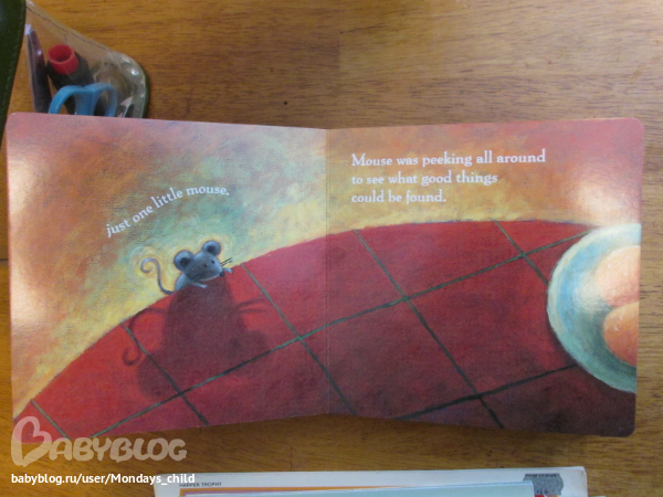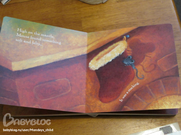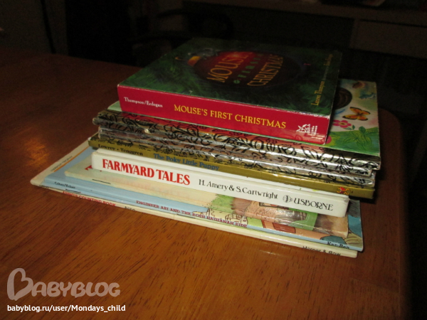 На самом верху стопочки - книжка про первое рождество мышонка. Ничего особенного, но симпатичная. Мышка изучает дом, украшенный к рождеству, а в конце встречает Санта-Клауса и тут дарит ей подарок))