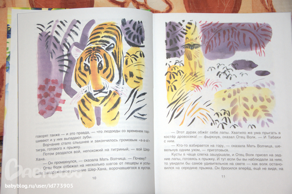 У меня в дестве был Митурича Маугли, мне очень нарвился) Хотя я не помню, во скколько лет его читала. Но помню, впечатление от картинок. Этого взяла, хотя в детстве был немного другой. Его я нашла только в сборнике Сказки века.