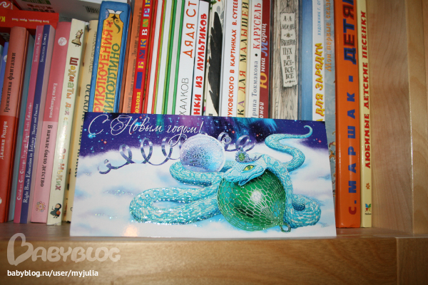 А открыточка с теплыми словами красуется на книжной полочке и поблескивает новогодним настроением!