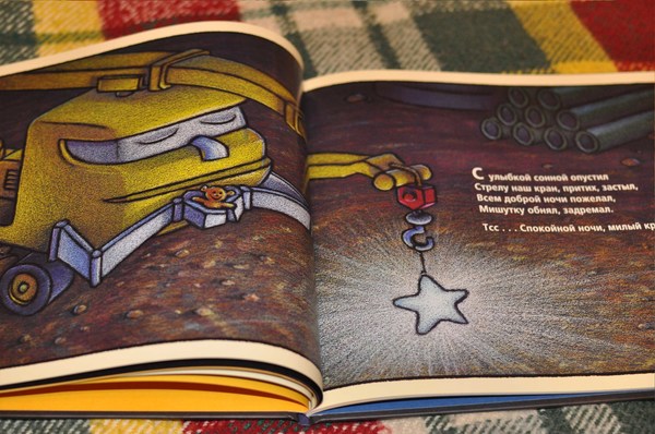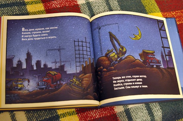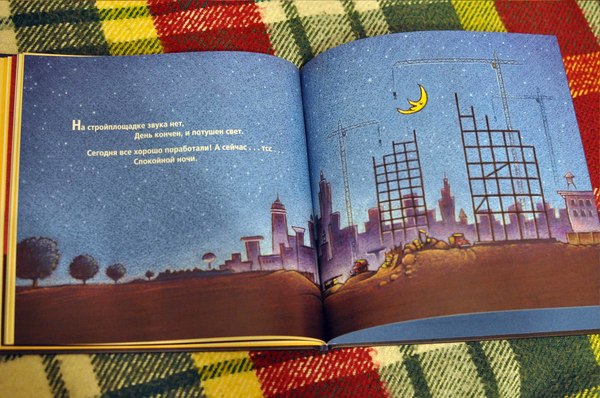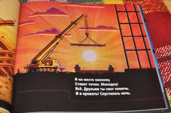 Настоящая засыпательная книжка для маленьких мальчиков. Это именно та книжка, которую можно почитать перед сном сынишке. День закончился и на стройке все затихает, все машины ложатся спать. Причём в книжке описано, какие именно машины на стройке - бульдозер, самосвал, кран и прочие.