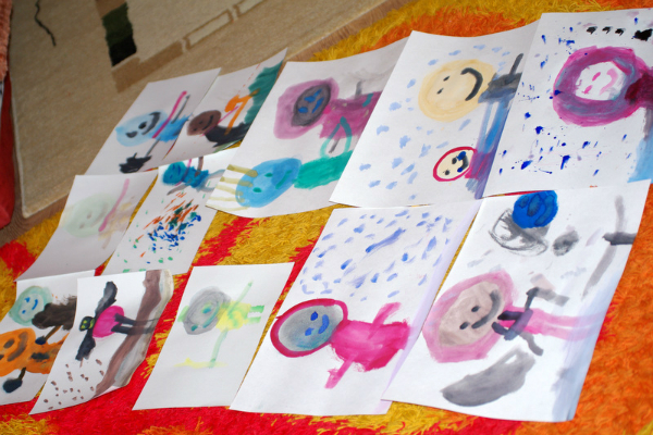 Аришка изрисовала подаренную бумагу, потом принялась за а3. Сама остановиться не могла, пришлось краски прятать, пока она ужинала :) На фото не все рисунки )))