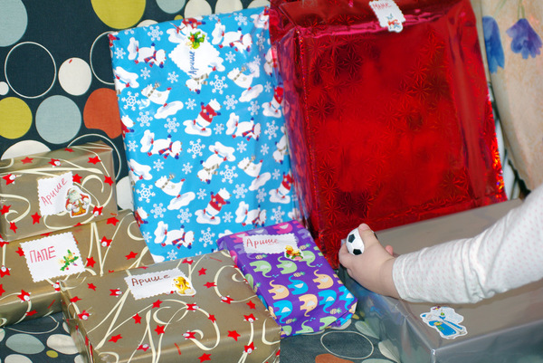 А вот что скрывалось за праздничной упаковкой (на фото уже нет конфет для папы, он, как я потом заметила, стоит за спиной и поедает их):