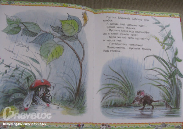 Книга замечательная еще и тем, что ее можно и не читать вовсе, а вести повествование только лишь по картинкам. И все понятно! Я была жутко удивлена, когда дочка, глядя на картинку, что внизу, тыкнула пальчиком сначала в мышку, а потом в грибок и сопроводила этот жест каким-то рассказом на языке волнистых попугайчиков...-))