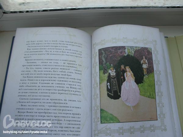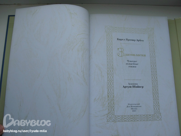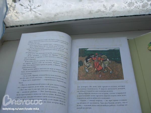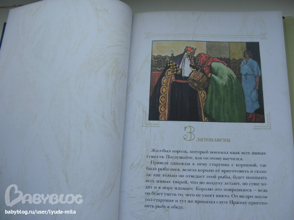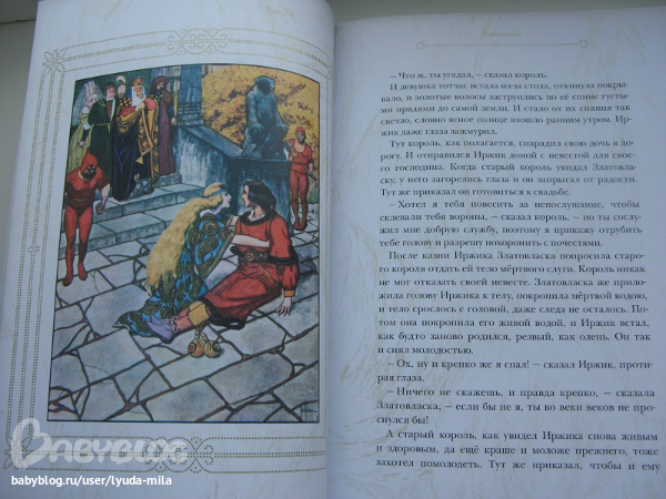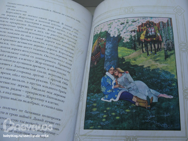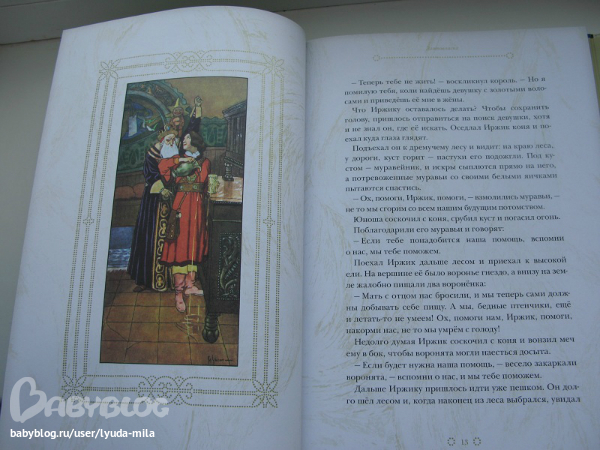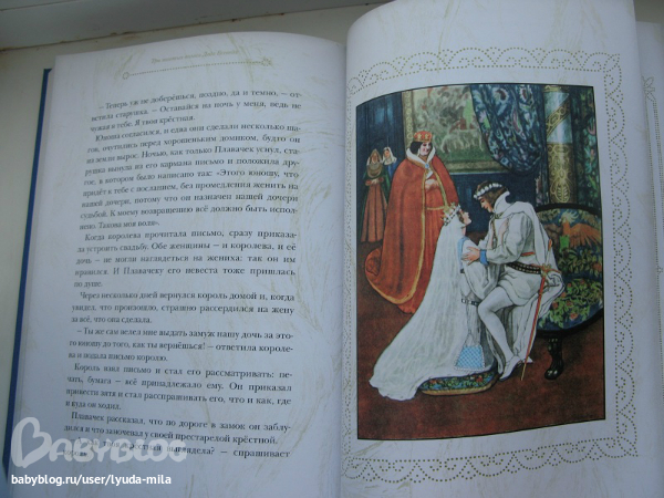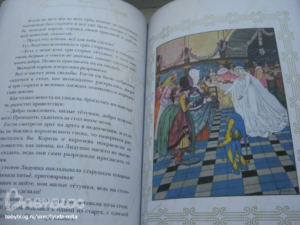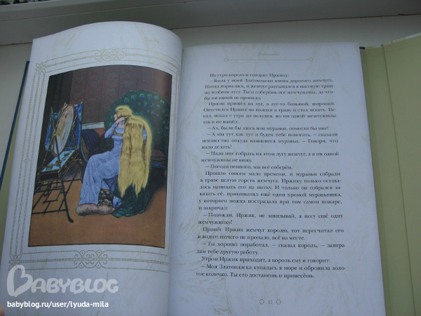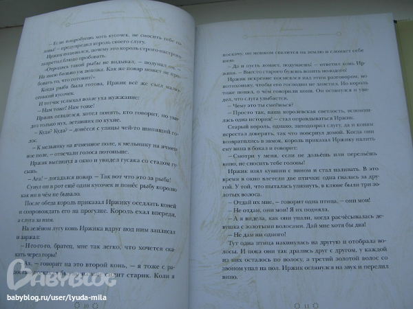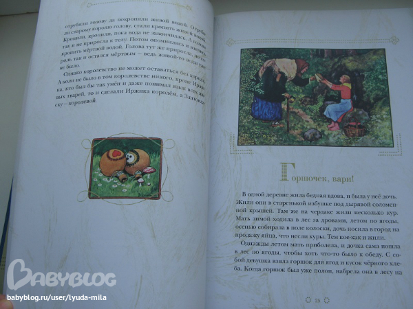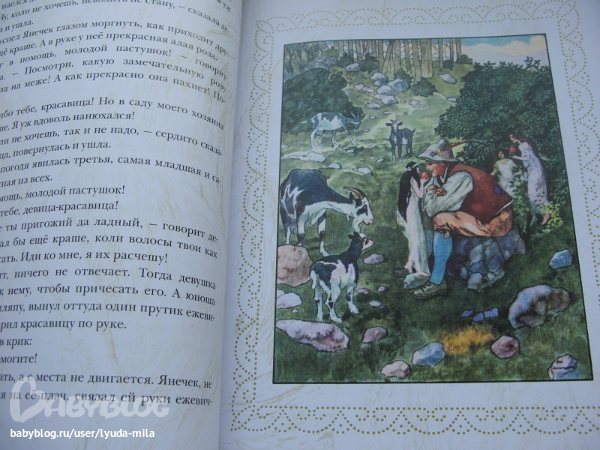 Сразу скажу, что прочитать пока не удалось, а первое впечатление от книги очень хорошее, поэтому не смогла удержаться, чтобы не поделиться с вами. Качество книги просто супер-супер!!! Если вам знакома серия "Перо Жар-Птицы", то вы поймете какая эта книга на ощупь. Толщина бумаги и качество страниц точно такое же. Единственное, обложка выполнена в виде дверки ( что мне кажется не очень удобно при чтении, не удобно держать книгу, получается эту дверку надо подворачивать под все страницы или читать так, чтобы книга лежала на столе) и глянцевые вставки. Иллюстрации есть полностраничные, есть на полстраницы, а так же маленькие рисунки в конце каждой сказки. Рамки тонкие золотистые, только вокруг иллюстраций. Постаралась нафоткать так, чтобы вы смогли как можно лучше разглядеть эту книгу. Первую сказку выложила полностью, а остальное выборочно.