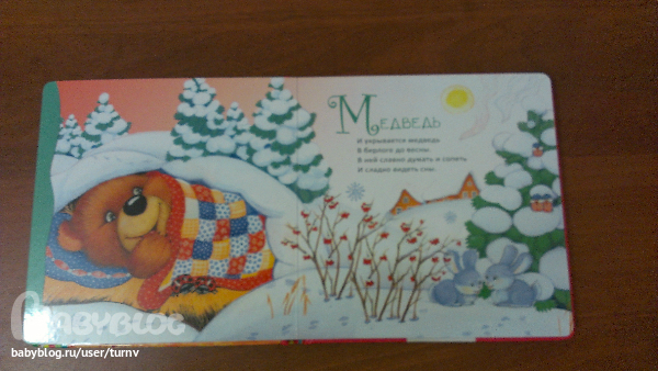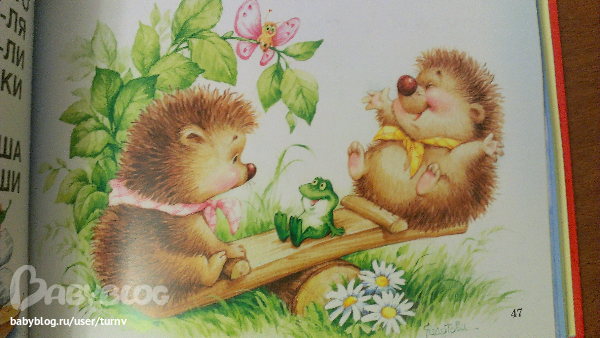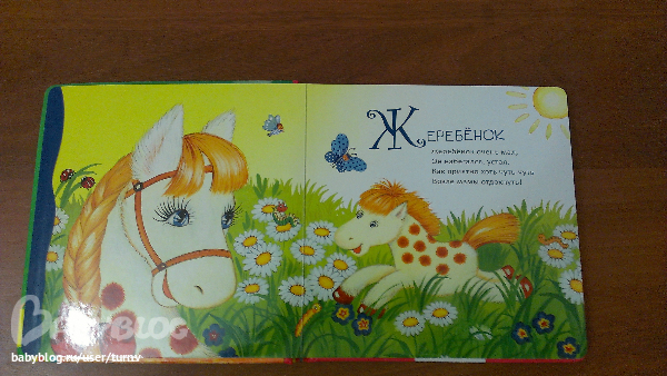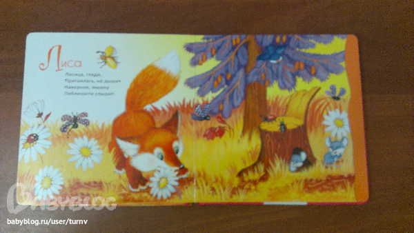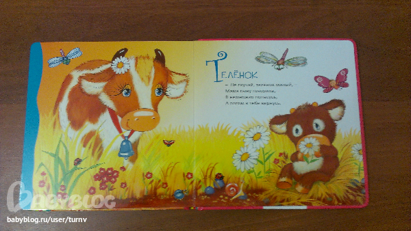 очень хорошее качество книги, толстые странички...яркие, хорошие рисунки...а вот стихи...на мой взгляд довольно примитивные....это конечно не для двухлеток книга...вот в годик, она бы нам очень подошла... так как картинки крупные, ного различных деталей (жучки, бабочки, цветочки)... но сейчас мы ее просто переросли...