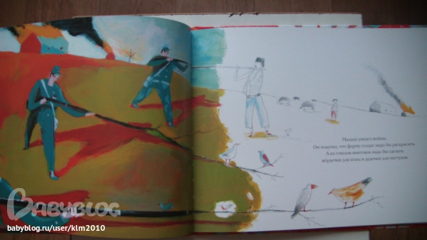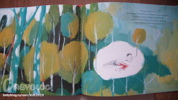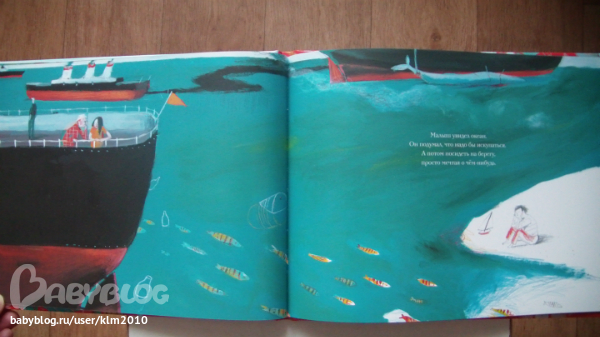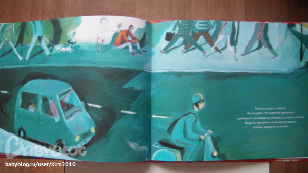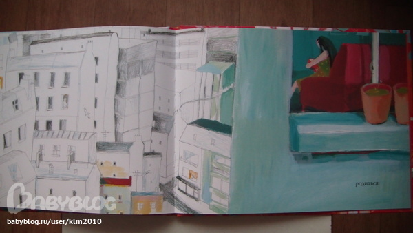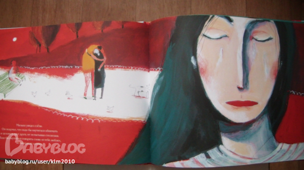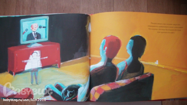 Что касается моего мнения: издание отличное, плотные мелованные страницы, текст не очень крупный, если книга предназначена для чтения младшими и средними школьниками, то можно было и покрупнее шрифт сделать. С возрастным цензом пожалуй соглашусь, для детей от 6 лет, потому что наверное в этом возрасте они уже в состоянии понять смысл и филосовский подтекст книги, хотя все в нашем мире относительно. Текста не много, что называется "коротко, но ёмко". Книга очень трогательная и трепетная. Вот так, сидя в утробе матери и смотря на мир с широко закрытыми глазами, дети легко решают проблемы, которые сильные мира сего решить к сожалению не могут или просто не хотят, они легко мечтают, рассуждают, фантазируют. Нас всех, когда-то выносила мать и мы все были детьми, но мы родились и нас научили как нужно жить в реальном мире и мы быстро забыли как все было легко когда-то. Книга безусловна будет полезна как детям так и взрослым. Иллюстрации Оливье Таллека легко расскажут эту историю и без слов и этим книга тоже ценна. Иллюстрации яркие и нарисованы как-будто ребенком, меня не оттолкнули, хотя прямо скажу, конечно на любителя, но моему слушателю пришлись по душе, а это самое главное.