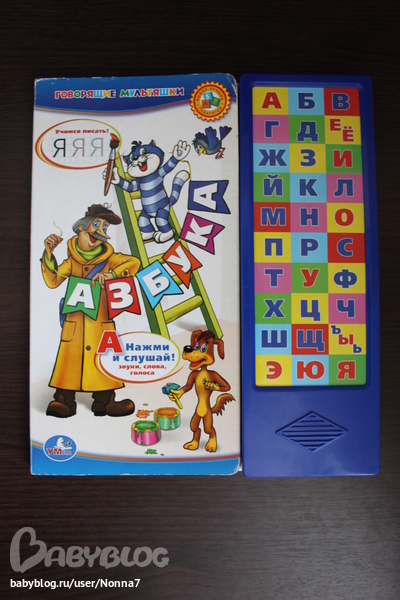 В ноябре где-то я приобрела в одном из магазинов говорящую азбуку, еще сомневалась долго над ней. Принесла домой и отдала заинтересованному ребенку, без какой-либо надежды на пользу от нее. Надежды не было, тк до этого пытались заниматься и дело у нас не шло, то мне терпения не хватало, то ребенку усидчивости:( Ну так вот, а говорящая азбука прижилась! Уже через несколько дней решила я протестировать свое гиперактивное дитя и была удивлена, все буквы он помнил на изусть, показывал необходимые и сам называл которые я показывала.