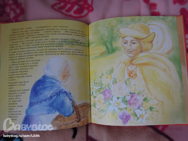 Еще в книге есть разворот, где старушка отдает золотой медальон, полученный от юноши с картинки сверху, беднякам с младенцем, спящим на улице города. Очень трогательная картинка, и учащая ребенка доброте и милосердию. Фотография не удалась, к сожалению.