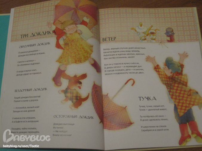 Издание интересное, листы мелованные. Иллюстрации мне кажется специфичные. Несколько стихотворений мне очень понравилось, Настя даже повторила за дождиком КАП-КАП, а до этого звуки не повторяла вообще. Но я рада что не купила эту книгу.