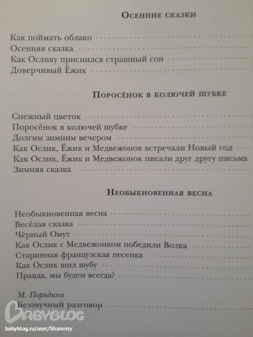 В этом сборнике представлены сразу 36 прекрасных рассказов о Ёжике, Медвежонке, Ослике и других персонажей, вышедших из-под пера С.Козлова. Например, в сборниках Лабиринта В "Трям! Здравствуйте!" рассказов 12, а в "Зимних сказках" всего 8. Так вот, не все рассказы дублируются!.