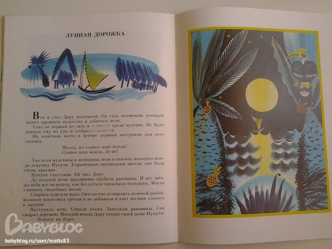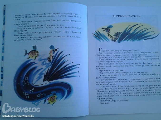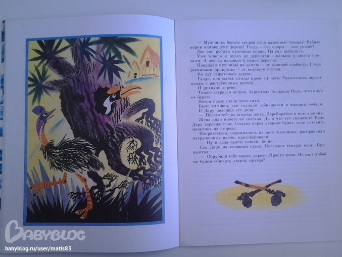 Повесть о мальчике Дару – это переработанные Борисом Колесовым сказки Океании. Дочь слушала и не разрешала мне останавливаться, пока не дочитали до конца. Сидела рядом и воображала, как же выглядит Дару на самом деле, такой умный, сильный и ловкий. А мне в очередной раз захотелось перенестись на остров Дару, плести на веранде циновку, и смотреть как дети наперегонки запускают свои лодки-однодеревки, а Большая Вода – мудрый, щедрый и такой непостижимый организм, шумит и напоминает, как огромен и прекрасен наш мир.