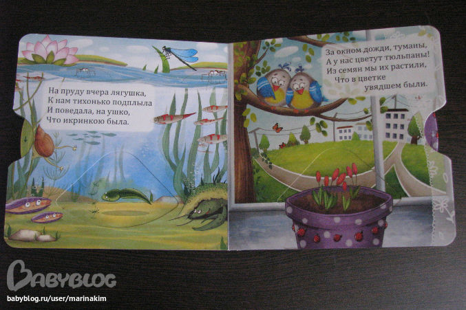 1. очень плотный картон. окошочки с крутящимся в страничке диском. при повороте диска появляются стадии развития, рыбки, лягушки, цветочка и тд. мне книжка очень понравилась. познавательная и очень крепкая.