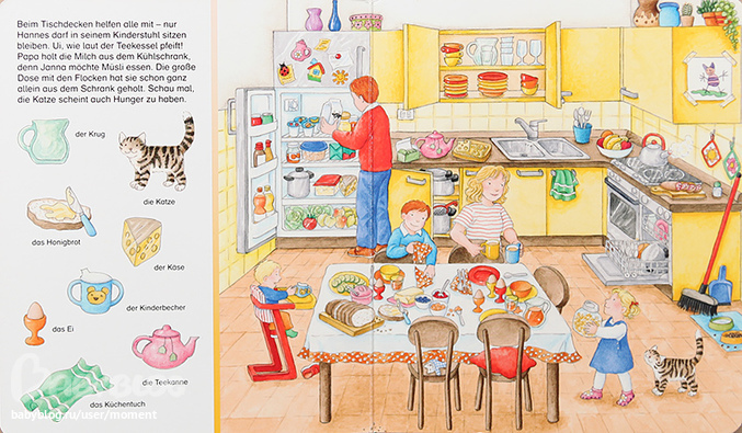 Я очень люблю эту книжку, потому что тут множество простых бытовых ситуаций, которые мы встречаем в обычной жизни. Рассматривая ее, тут же можно проводить параллели и показывать предмет живьем.