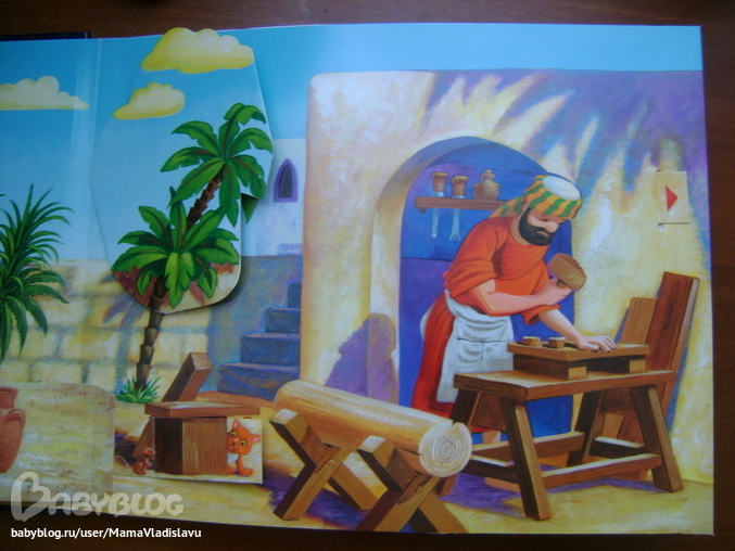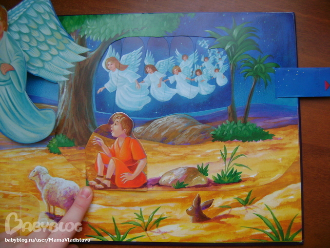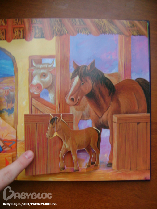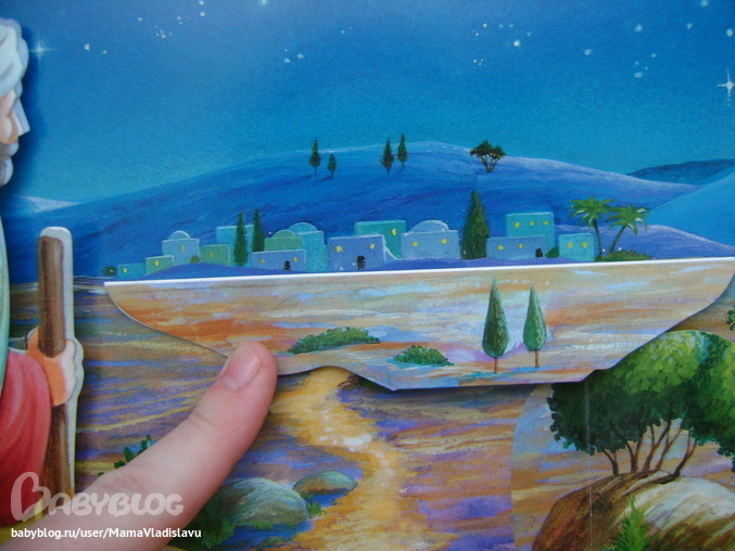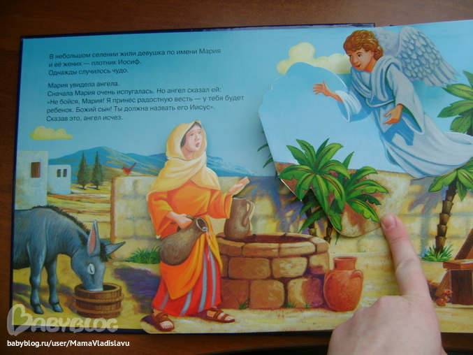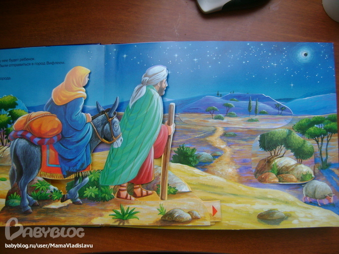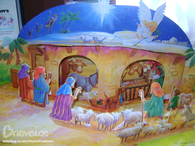 По мимо этого на каждой страничке есть стрелочки,которые приводят в действие панормаку)Дочке очень понравилось когда Мария качает младенца на руках )И много разных окошек с секретиками