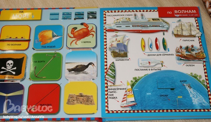Море, Анна Казалис. Эту книгу можно назвать разочарованием. Задумка неплоха, даже очень, муж сначала было впечатлился даже, но исполнение просто ужасно. Да, действительно очень много окошек, но они рвутся, не успеваешь ты даже их раскрыть, некоторые вообще никак не поддеть. Если у взрослого возникли такие трудности, то что уж говорить про малышей... А цена, мягко сказать, совсем не маленькая. Формат книги - больше А4, примерно квадрат. Всего 4 разворота, на фото все они представлены.