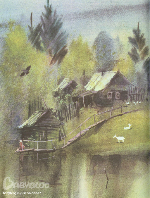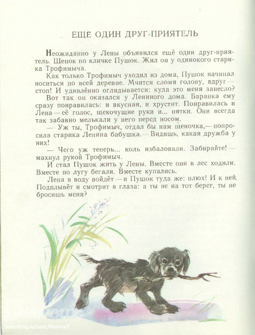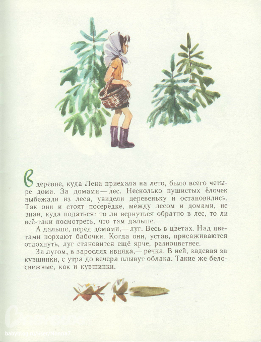 Снова и снова я восхищаюсь творчеством Владимира Дугина, все иллюстрации изумительно точно передают текст, они так хороши. Мы только открываем книгу и вот уже с первой страницы едем в электричке, которая привозит нас, вместе с девочкой Леной, в глухую деревеньку, к бабушке. И вот мы здесь! Глушь и тишина, вокруг лес, и только «несколько пушистых ёлочек выбежали из леса, увидели деревеньку и остановились…». Деревня всего в четыре дома. Сразу за домами лес, за лугом, в зарослях ивняка речка. И вот уж нам и дышится легко; и мы чувствуем запах лета, вкус детства. А прозрачный, чистый воздух наполнен ароматами пряных трав, которые в жаркий летний день щекочут нам нос. Где, как ни здесь, можно подружиться с природой?! Вот и Лена находит себе тут много новых друзей. И до каждой мелочи есть ей дело, со всем вокруг нужно познакомиться, попавшим в беду помочь. Так Лена выкормила черного цыпленка, отвергнутого наседкой, спасла пойманного Трофимычем окуня, выпустив его на волю, пожалела она и рака. Еще один друг-приятель появляется с самого начала, это щенок по кличке Пушок, ведь вместе намного веселей и в лес ходить, и по лугу бегать, и купаться. А уж, сколько всего интересного, можно наблюдать вокруг: как лосёнок хотел воды напиться и запутался где настоящие сосны, а где отражение; о чем ласточки разговаривают; что коршун под облаками делает; откуда муравьиные тропинки берутся; почему птенцы воробьев были притворщиками. И, конечно, это не все приключения Лены, ведь лето такое длинное, а природа совсем рядом. Замечательные рассказы Владимира Волкова, в паре с иллюстрациями Владимира Дугина, переносят нас в солнечное детство, даже если оно прошло в обычном городском дворе, среди асфальта и бетона. J