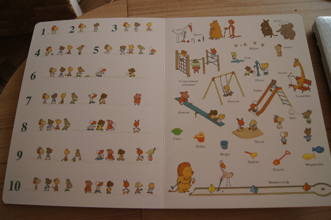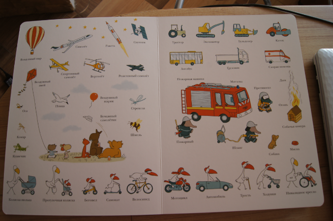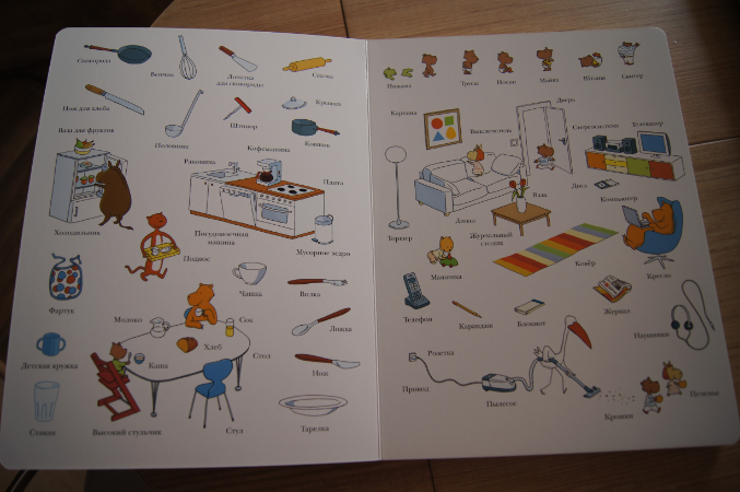 Главное мне не нравится именно подача. Просто нарисованы предметы. Как карточки, называешь и всё. Но с карточками можно играть (кто по карточкам с детьми занимается, тот понимает о чем я). А тут и этого нет. Лучше бы я еще какой виммельбух купила. Там придумывать неперепридумывать, и сюжет и действия и куда как больше разнообразных вещей.