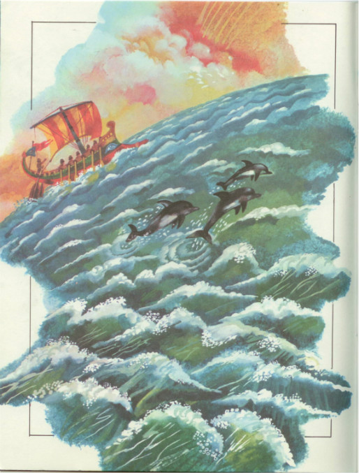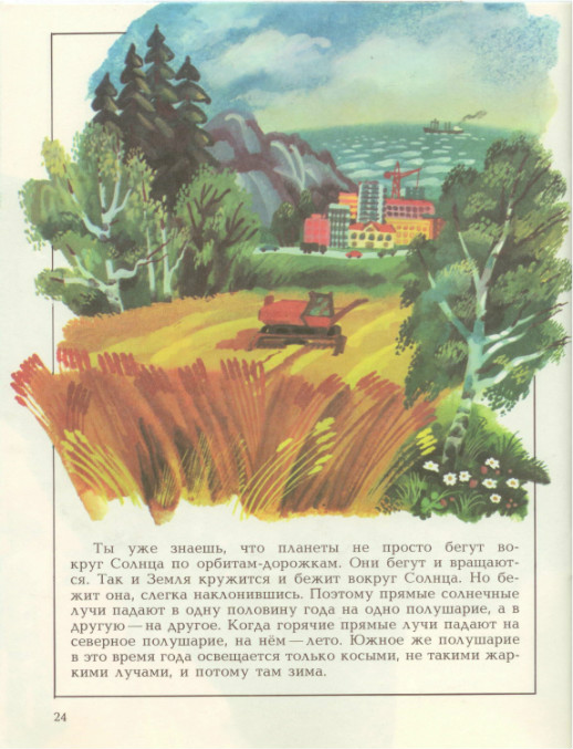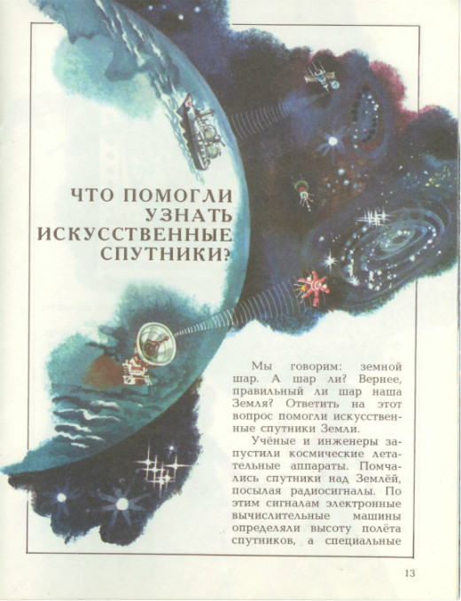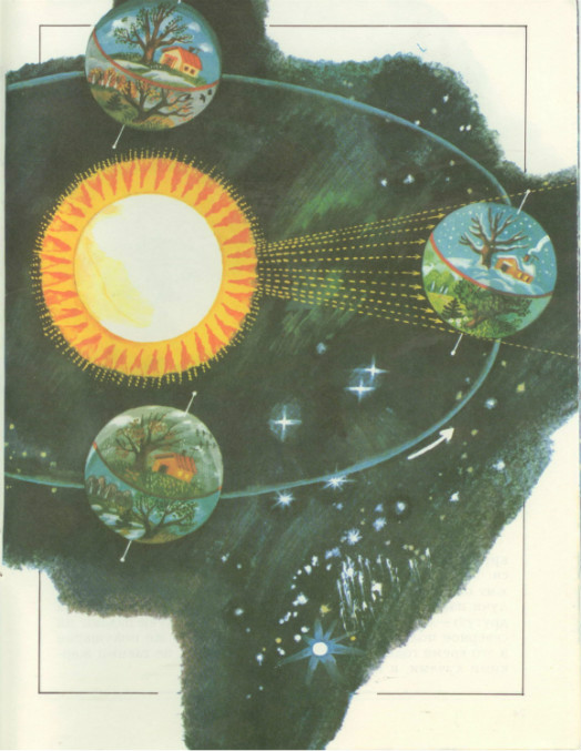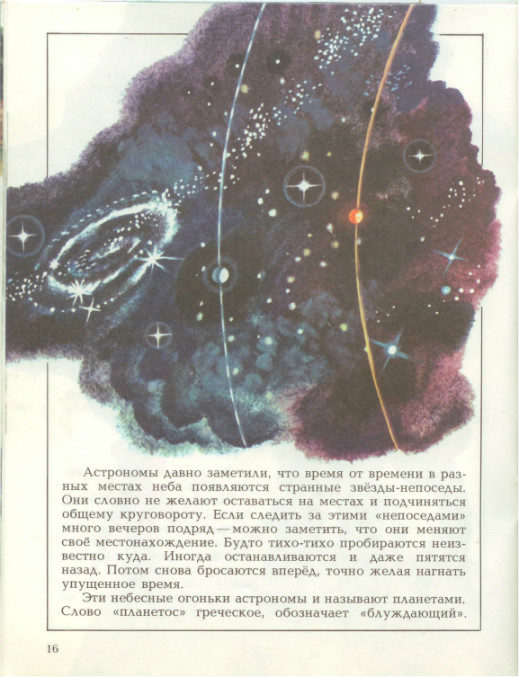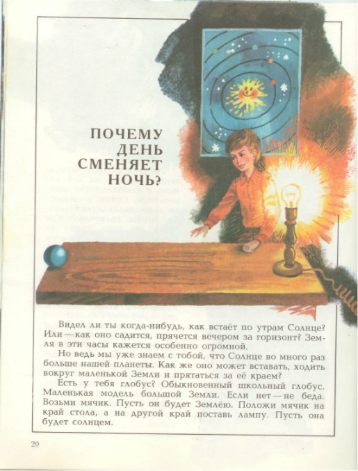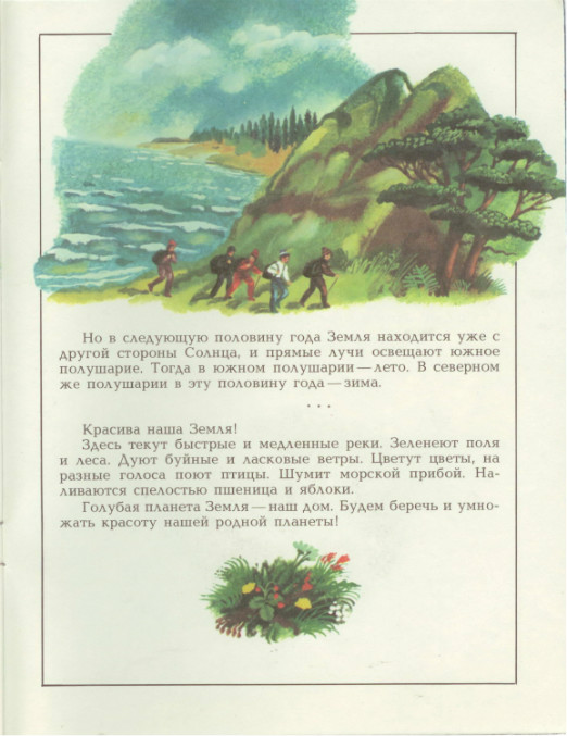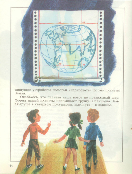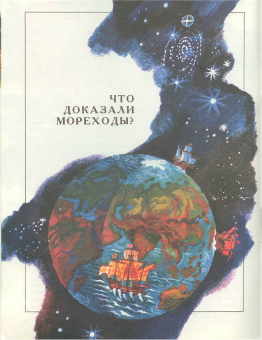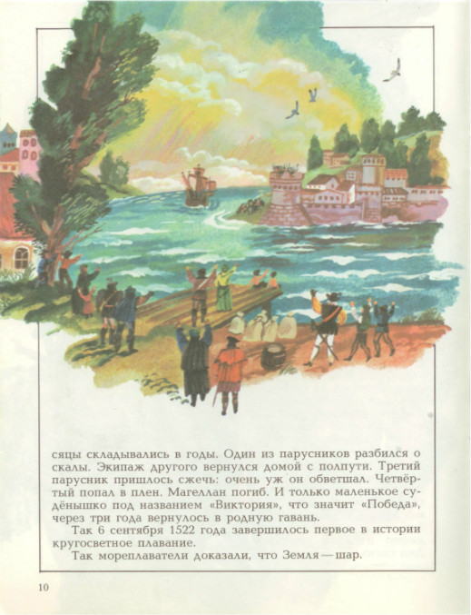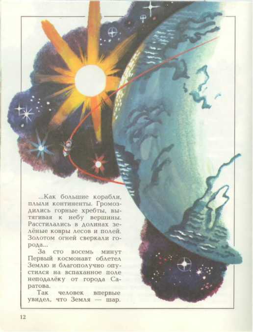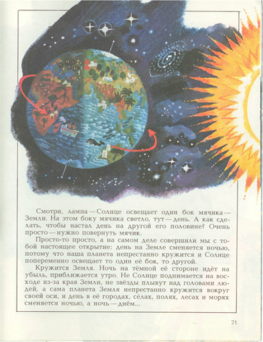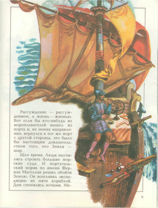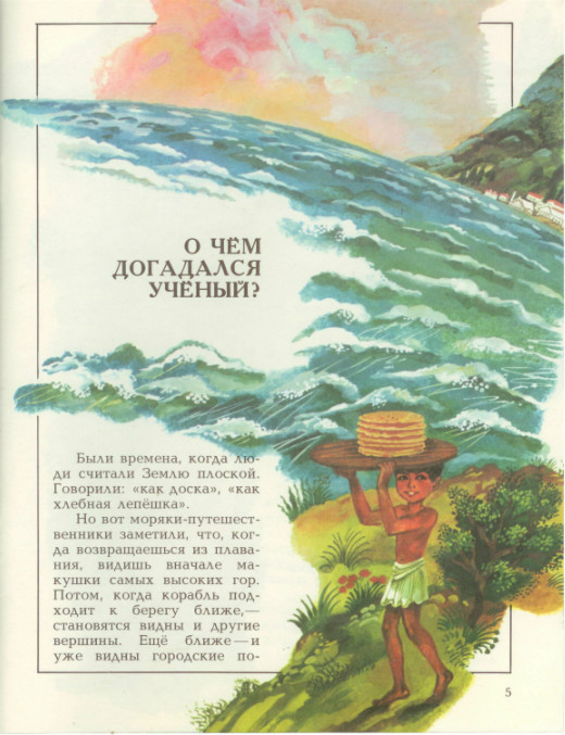 Автор рассказывает, что совсем давно люди считали Землю плоской "как хлебная лепешка", тут же художник изображает мальчика с хлебными лепешками. Тут мы немного пофантазировали и представили, что если Земля-лепешка, то люди могут жить только сверху и снизу и уж никак по бокам. А моряки-путешественники первые заметили, что это неверная догадка, тк Возвращаясь домой они вначали видели верхушки самых высоких гор, а уж затем все, что ниже. Художник очень логично нарисовал иллюстрации, и наглядно передал слова автора, и так на протяжении всей книги...