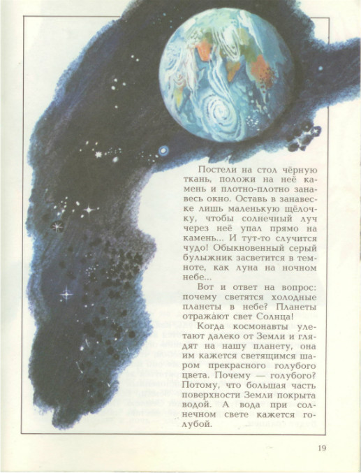 Оказывается мой сын уже обладает некоторыми знаниями о Космосе, солнечной системе, планетах и звездах!!!!!!! Я была приятно удивлена. Он с энтузиазмом отвечал на вопросы, например, почему наша Земля, если смотеть на нее из Космоса, светится голубым светом; почему меняются времена года... Не дожидаясь окончания рассказов, перебивал меня чтоб заранее сделать собственные выводы) Торопыжкин мой) Выводы он делал благодаря иллюстрациям, которые идеально дополняют текст. В книге есть несколько опытов, которые автор предлагает провести, что б лучше понять то или иное явление природы, а художник все эти моменты проиллюстрировал.